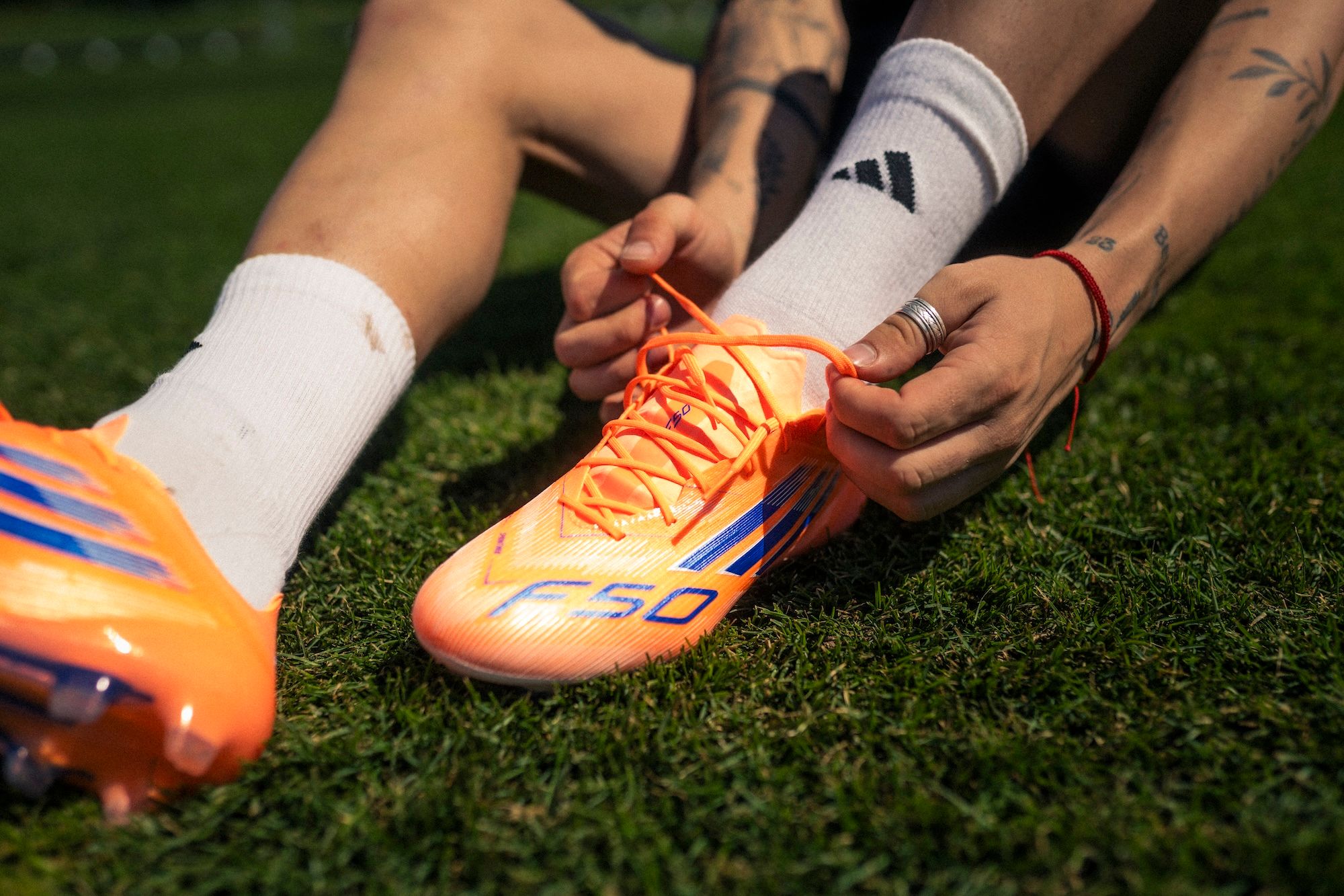 The new collection's titular tone is "Signal Coral," but hits of "Beam Orange," "Lucid Blue," and "Off White" enter the picture across different offerings. The Adidas Predator arrives in Fold-over Tongue (FT) and Laceless options, with the speed-oriented F50 also landing in two styles.