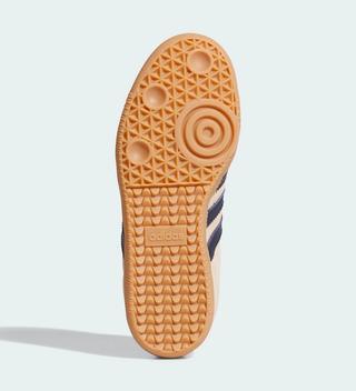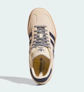 Most of the shoe is crafted from light tan suede, complemented by tonal leather tongues and liners, creating a clean and cohesive look. Navy accents appear on the Three Stripes overlays, brand embellishments, and heels, adding just enough contrast without overpowering the minimalist design. Sitting atop a light gum rubber tread, this version of the Samba offers a perfect balance of style and functionality.
