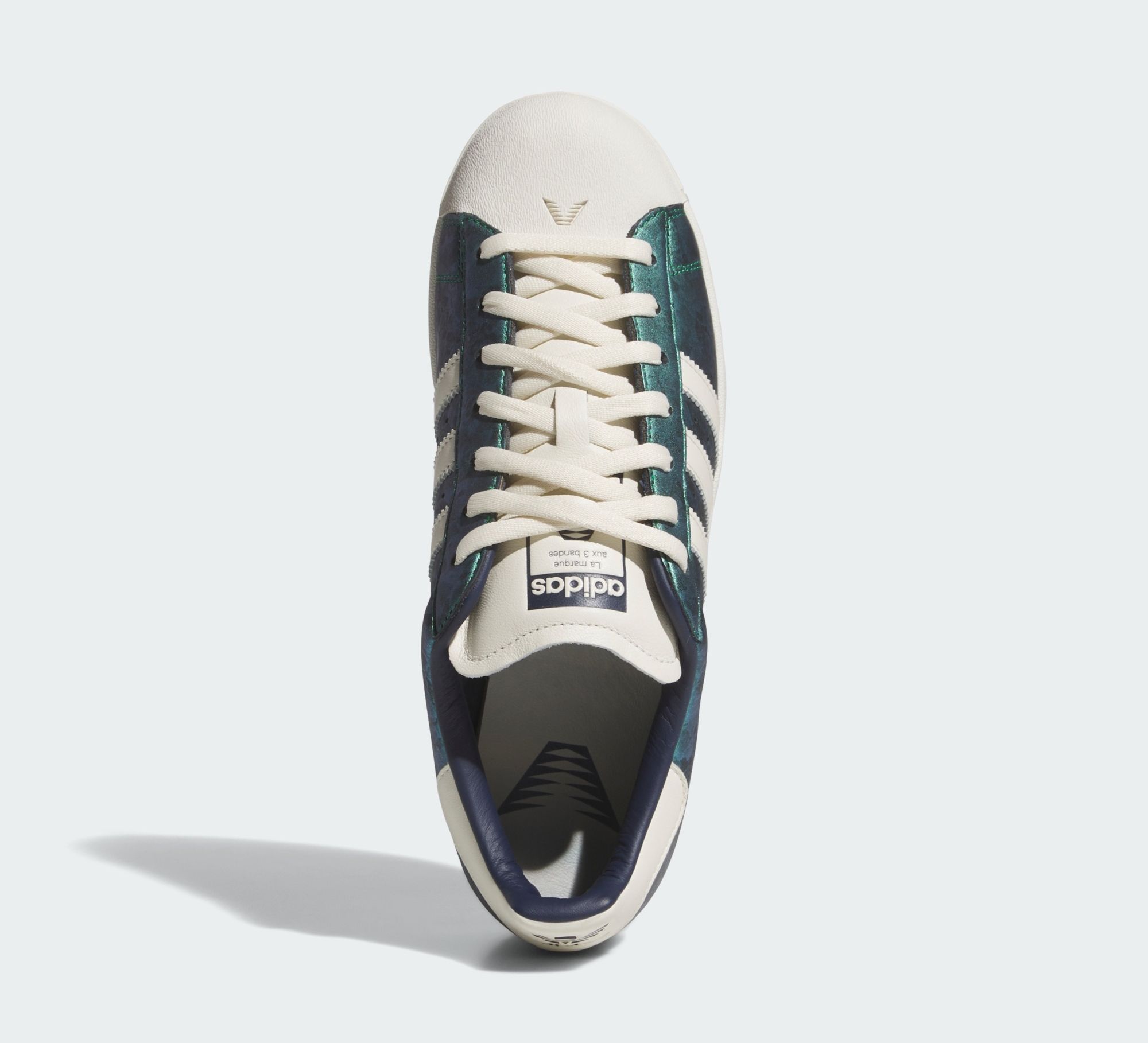 This off-court capsule delivers contrasting concepts. The first pair arrives with a shimmering, iridescent glitter finish across its upper, giving the classic shell-toe a bold, eye-catching refresh. The second adopts a more textured look, dressing its panels in faux crocodile skin with vibrant colored accents that shift from green to blue. A third option sees high-quality leather uppers reimagined in a gradient patterned finish that brings green into the mix. All pairs retain the Superstar’s timeless toe cap and Three Stripes detailing, while a custom metallic hangtag adds a signature touch.