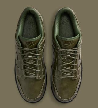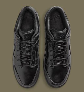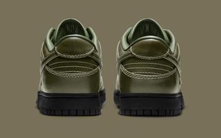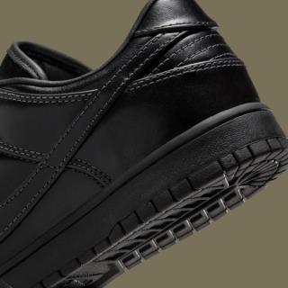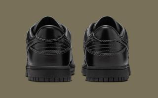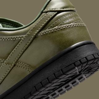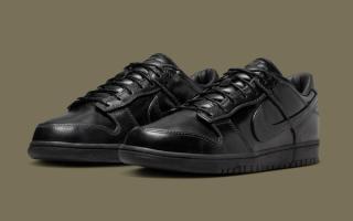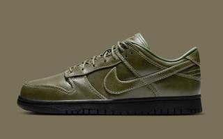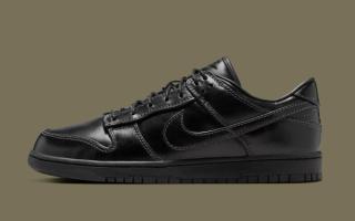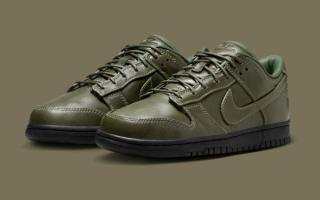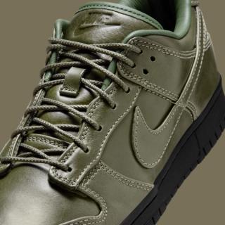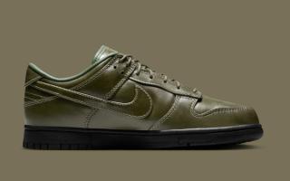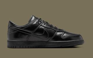 Early images reveal two leather-wrapped Dunk Lows, one in full triple-black and the other in a rich olive finish. Both pairs are fitted with smooth, uniform leather uppers, tonal stitching, and subtly refined paneling that lean more toward the formal than the sporty. The black colorway skews traditional, echoing the look of an office-ready derby, while the olive edition brings a more contemporary, fashion-leaning edge. Each sits atop a black rubber sole for durability, keeping the familiar Dunk footprint while adopting a distinctly elevated mood.