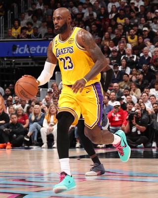 LeBron James wearing a Nike LeBron 23 basketball sneaker inspired by the "South Beach" LeBron 8 sneaker from 2010.
